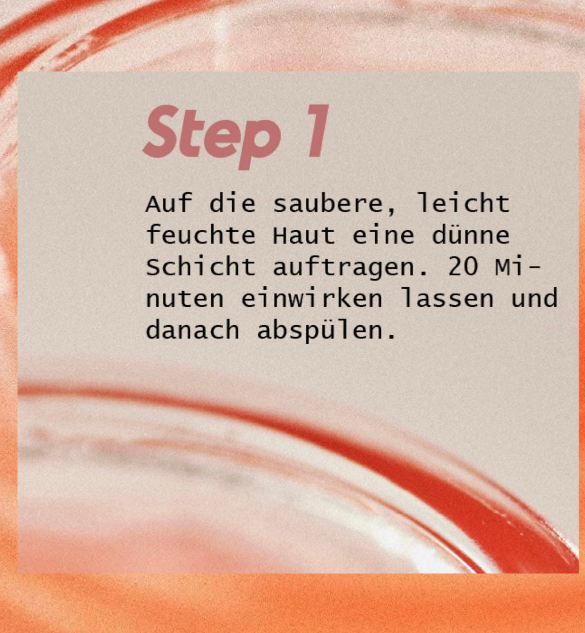 Anwendung: Auf die gereinigte Haut eine dünne Schicht auftragen. 20 Minuten einwirken lassen und danach abspülen oder nur abtupfen (nur wenn abends aufgetragen, dann morgens das Gesicht waschen damit die Säuren über den Tag nicht mit Sonnenlicht reagieren)