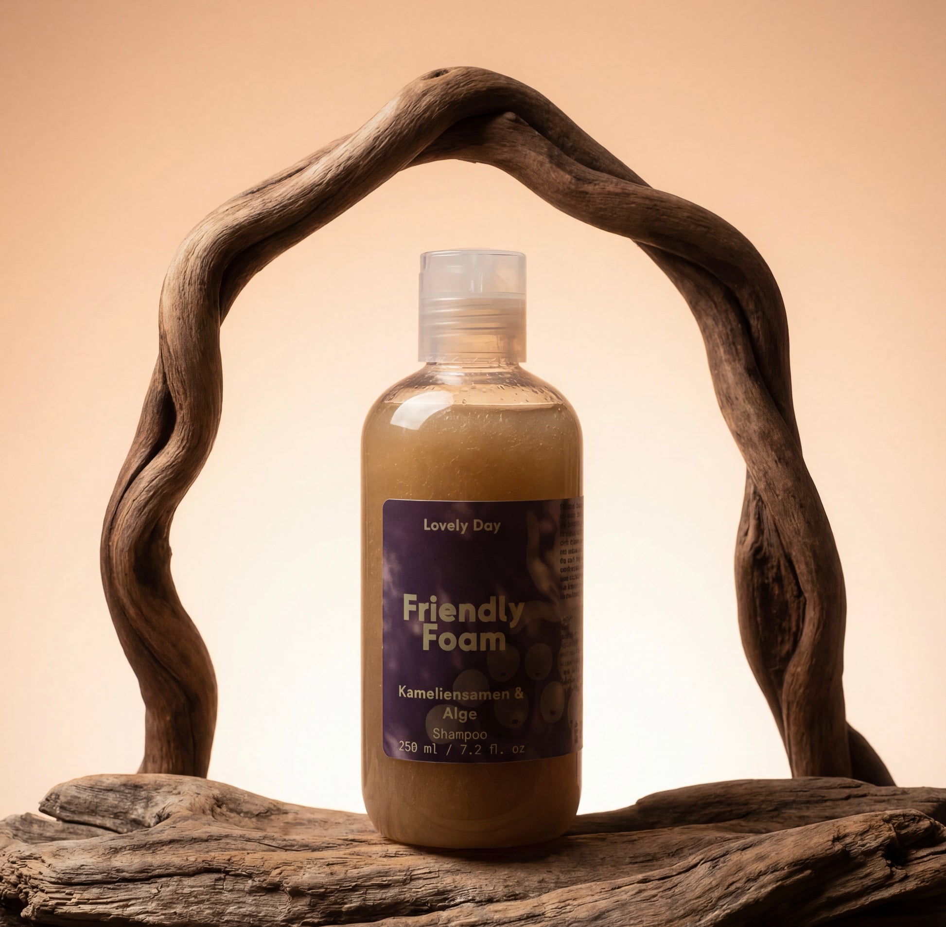 Shampoos bestehen aus sogenannten Tensiden, waschaktive Substanzen die reinigend wirken. Tenside werden weltweit eingesetzt in Shampoos, Putzmitteln, in der Industrie und werden in der Regel aus sehr großen Mengen Palmöl hergestellt. Da wir Menschen ein hohes Bedürfnis haben und zu reinigen, ist der Ressourcenverbrauch durch Shampoos enorm.Unser Friendly Foam Shampoo reduziert den Einsatz dieser Tenside, denn wir benutzen als Haupttensid einen Extrakt aus den Pressresten der Kamelienölproduktion.